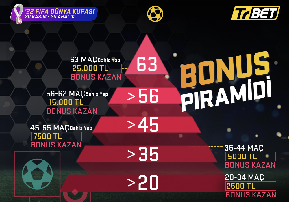 Bahis platformları 2022 Dünya Kupası için özel olan birçok bonus size sunar. Trbet bu alanda uzun yıllara varan bir işlem ağına sahip. Bu yüzden 2022 dünya kupası için de önemli olan bir alt yapı ve bonus ile size yardımcı olur. Bu alanda en çok bonus veren spor dalı da yine dünya kupası olmaktadır. Bunun için “DÜNYAKUPASI2022” alanına site içinde tıklamak gerekir.